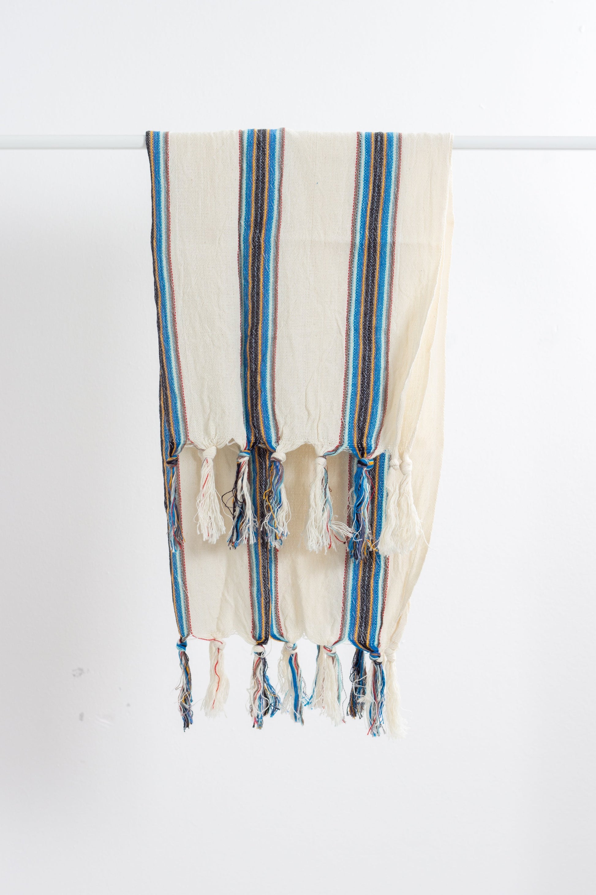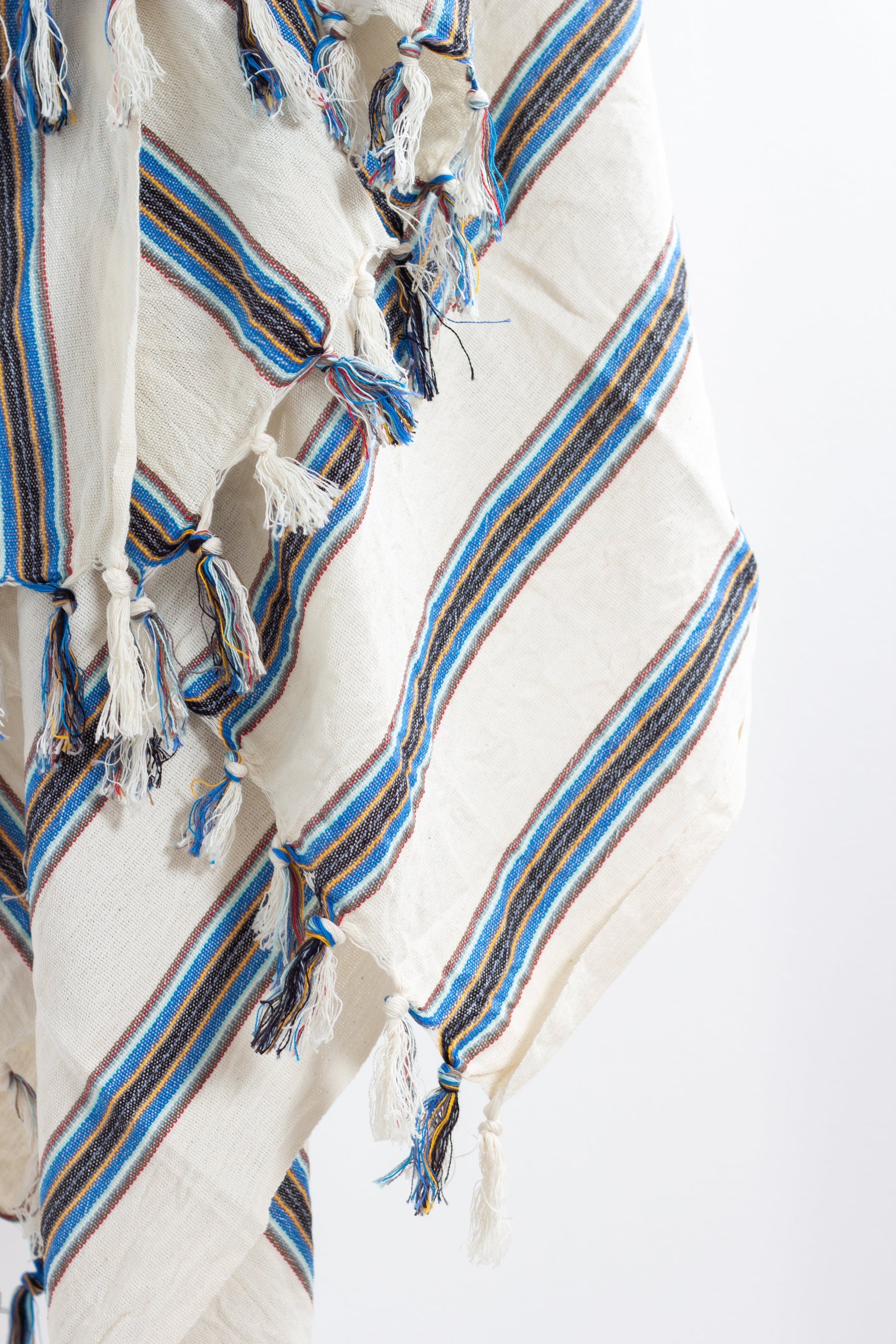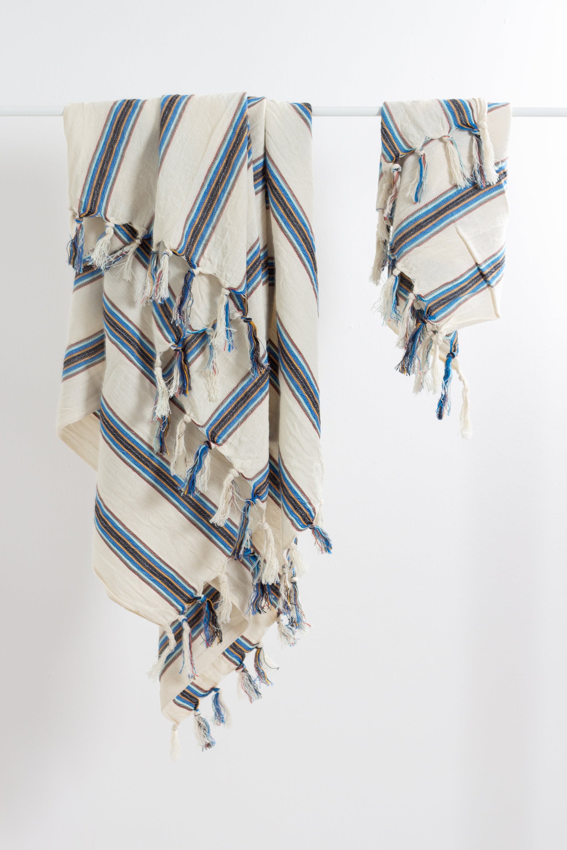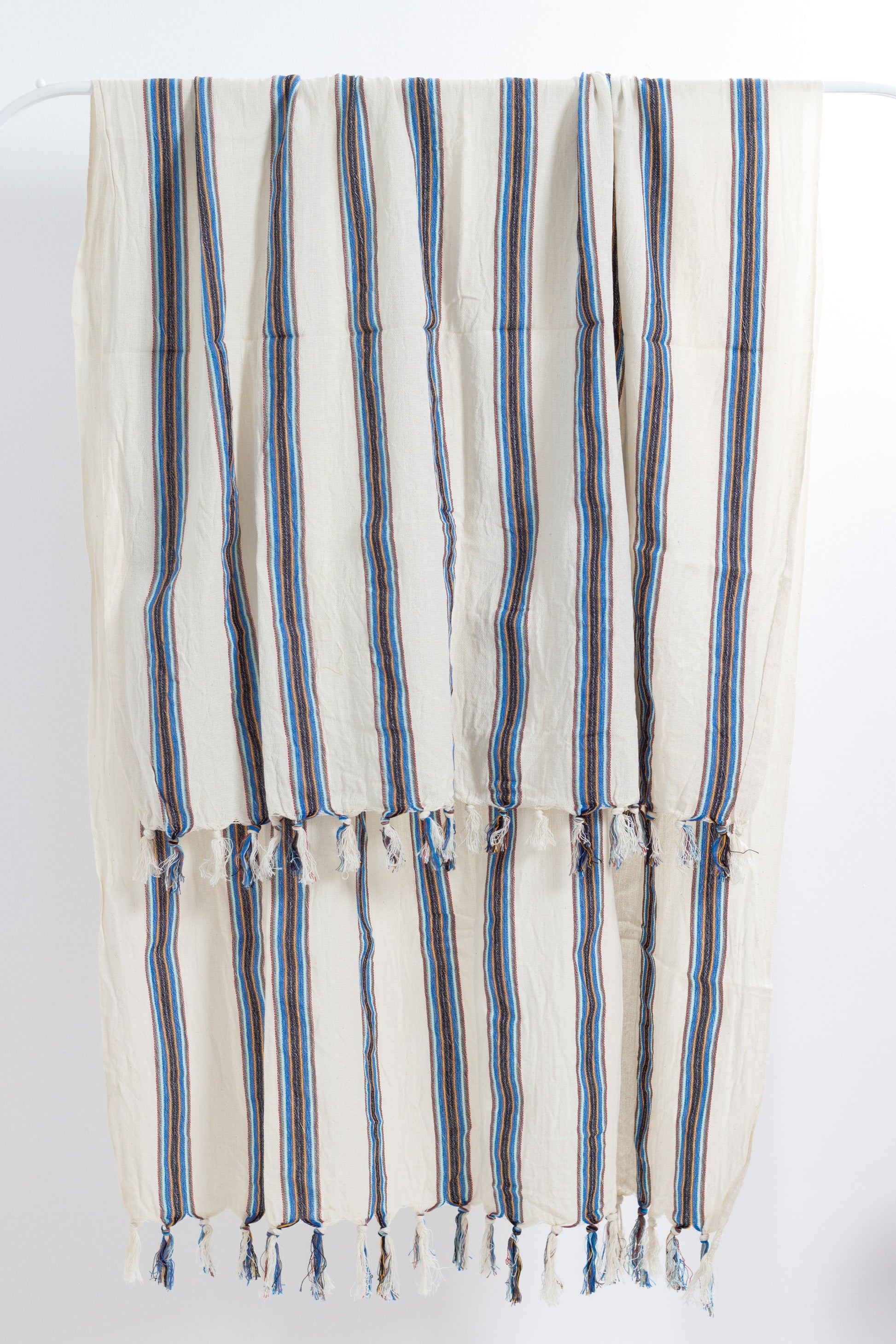 Add a touch of elegance and style to your bathroom with our hand-woven "Ani" towel. Made in Turkey on traditional semi-automatic looms, this towel is crafted with sustainable cotton and linen fibers. The unique striped design in beige, blue and brown colors gives it a modern and versatile look. Not only is it soft and absorbent, but it becomes even more so with each wash. With its durability and multi-use functionality, this towel is perfect for everyday use or for special occasions. Lightweight and breathable, it's also great as a beach wrap, baby cover, picnic blanket, tablecloth, and even a shawl. Treat yourself or gift it to a loved one and make a difference in the world with this premium towel.
