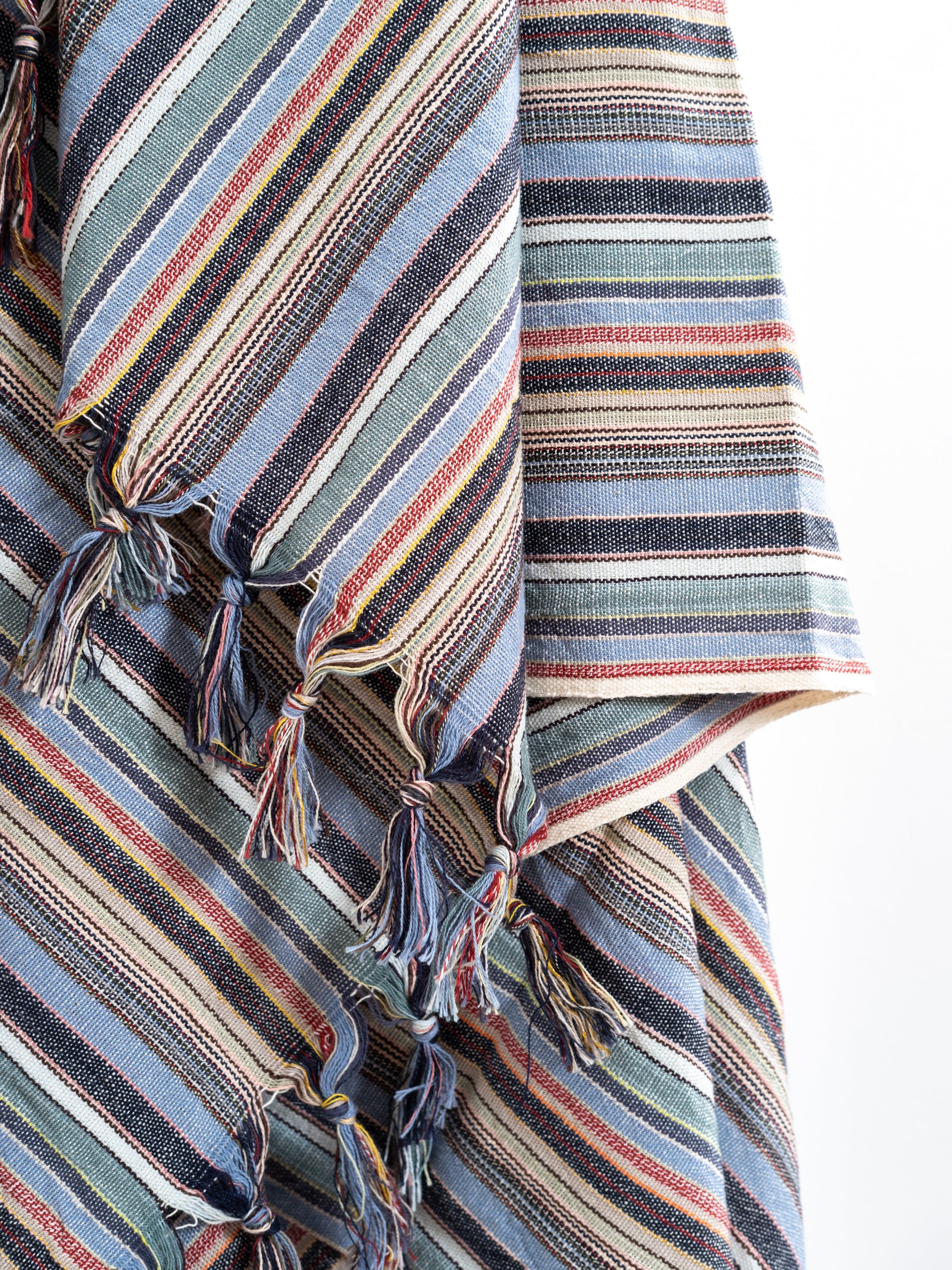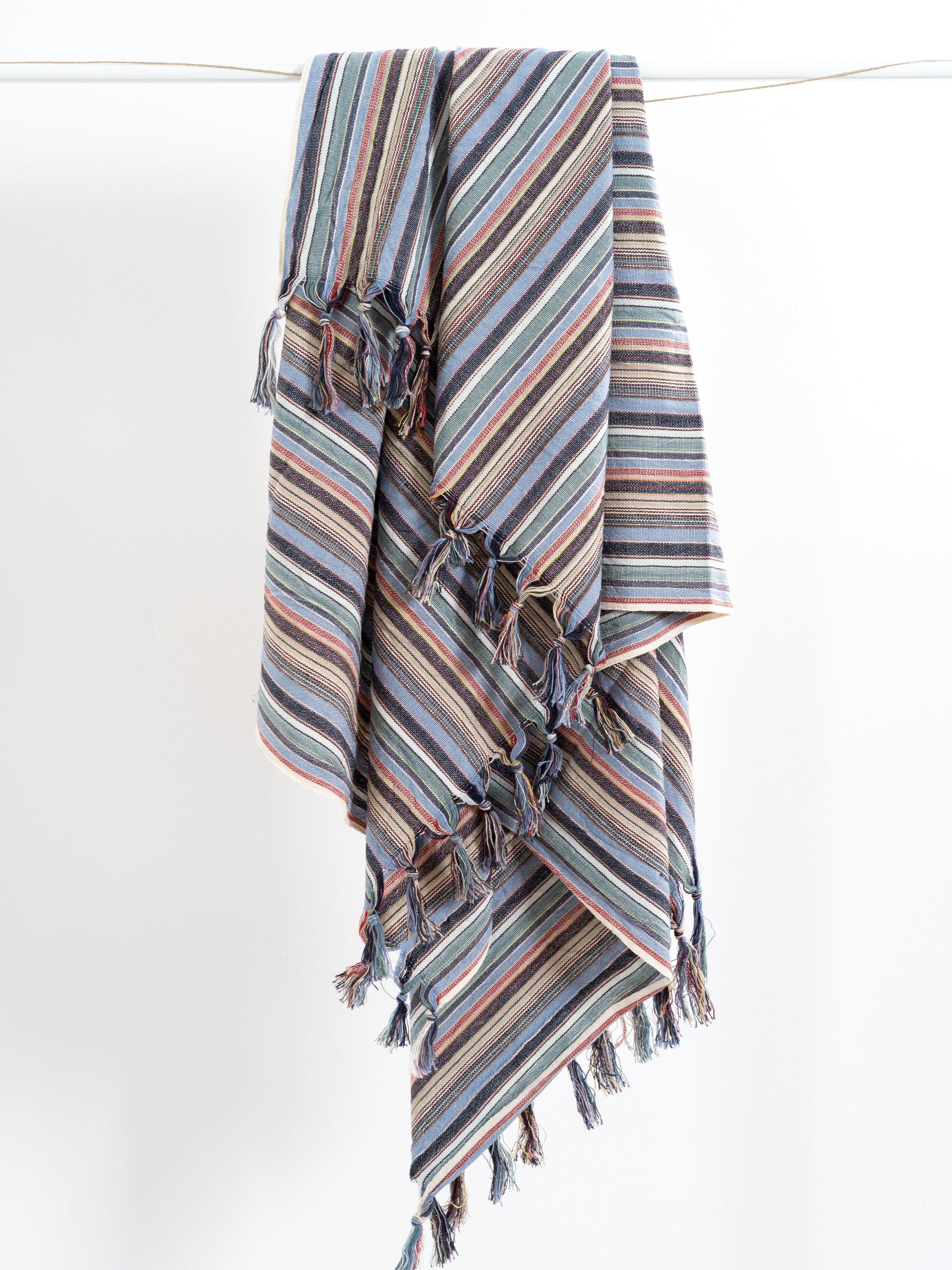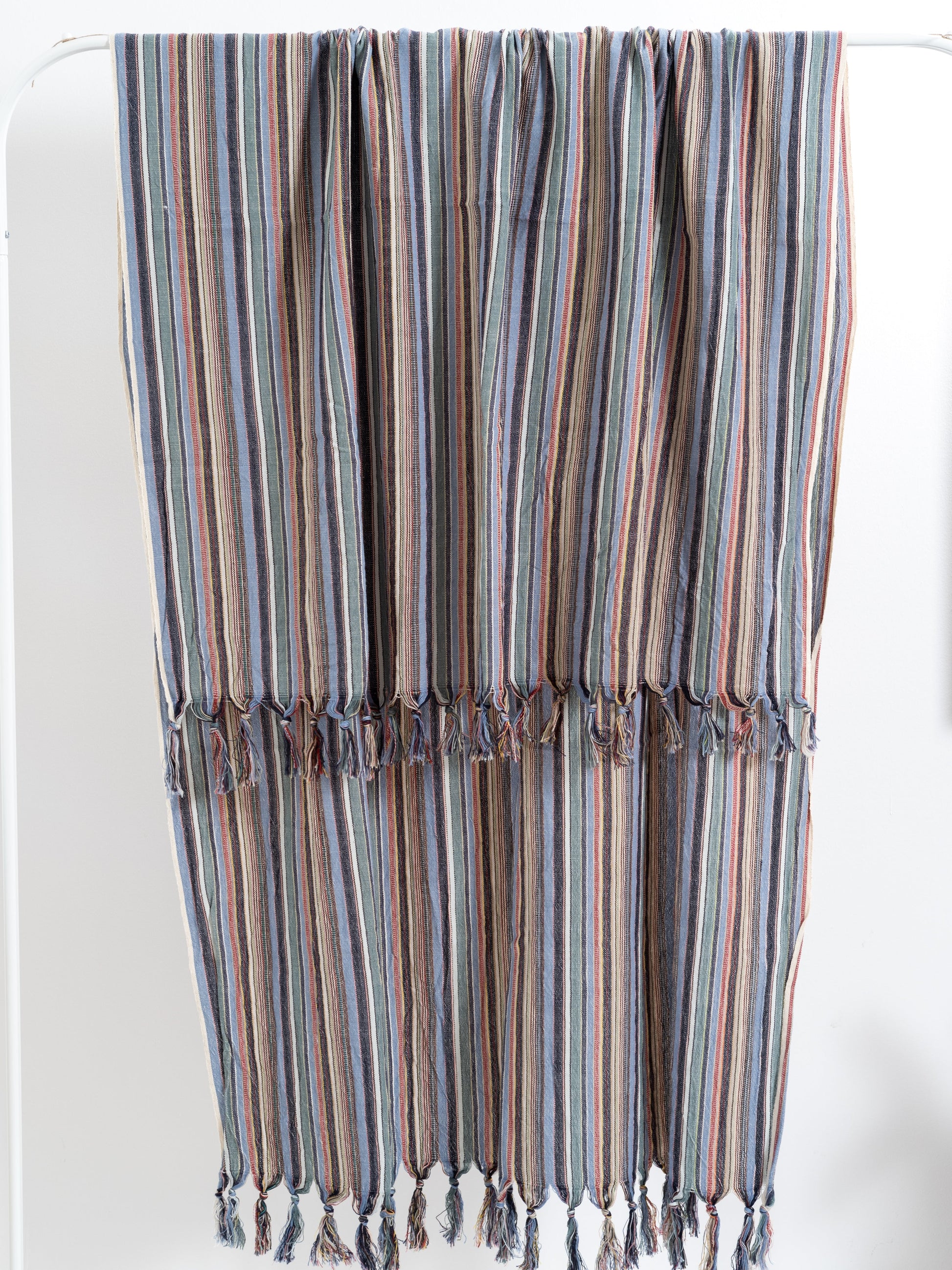 Introducing the Behram towel, a unique and versatile addition to your home. Woven on traditional semi-automatic looms in Turkey, this oversized towel is made from a blend of sustainable cotton and linen. The gray, blue and green colored stripes add a touch of elegance to any room. The Behram towel is not only soft, absorbent, and quick-drying, but also gets softer with each wash. With its multi-use functionality, it can be used as a beach towel, picnic blanket, or even a stylish shawl. Elevate your home decor with Behram towel while also reducing waste.