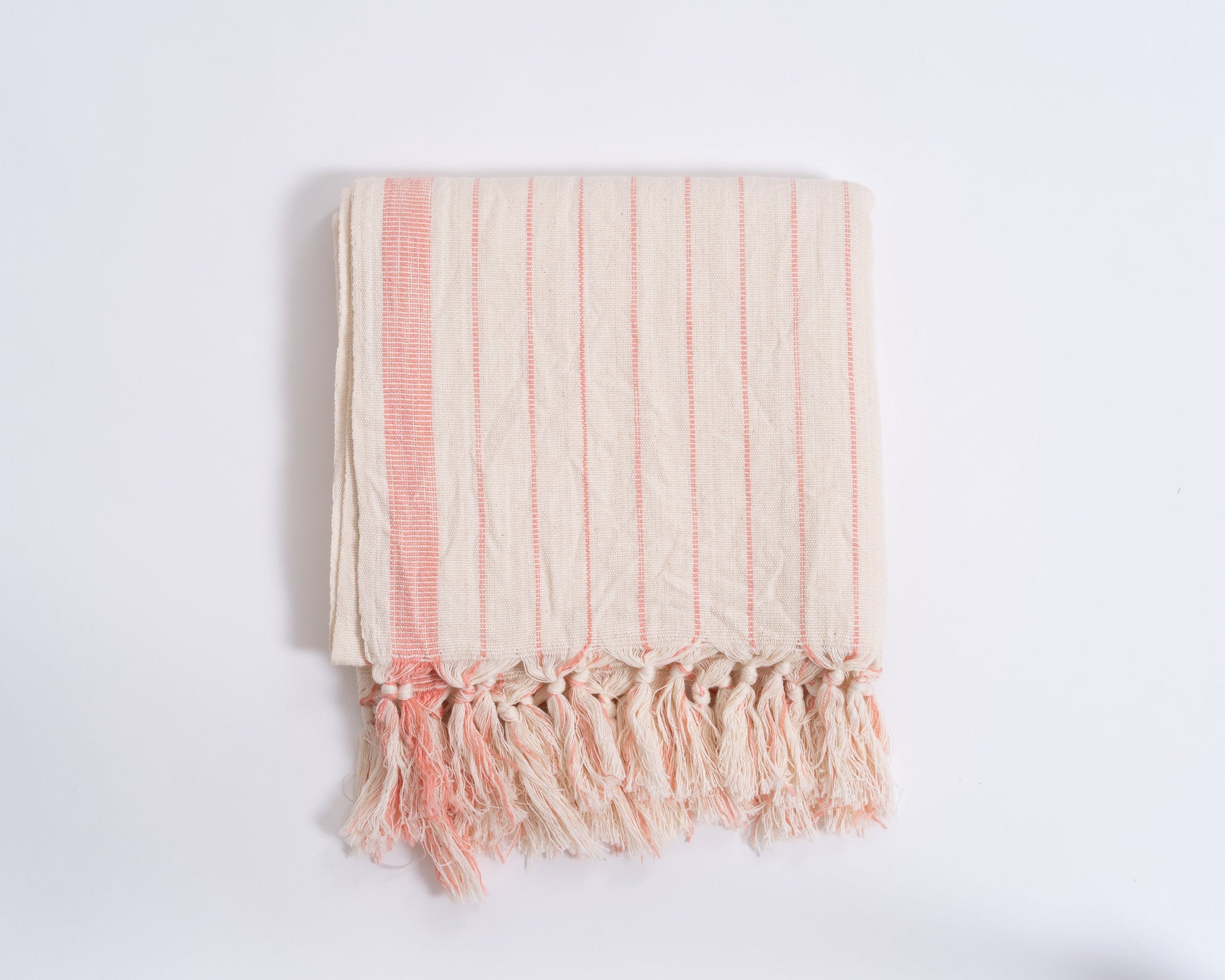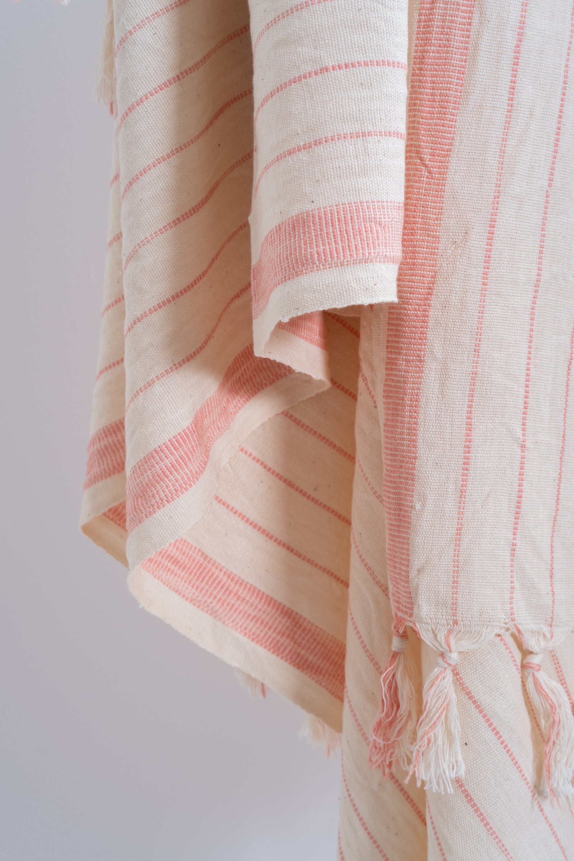 Introducing the Drama Coral Towel, a luxurious addition to your bathroom decor. Made with a blend of sustainable linen and cotton, this oversized towel features bold coral stripes on a classic beige background. The thick, fluffy fibers make it ultra-absorbent, while the natural linen ensures quick-drying capabilities. Use it as a traditional bath towel or drape it over your couch as a cozy throw. Its versatile design makes it perfect for indoor or outdoor use, whether you're lounging by the pool or snuggling up on a chilly night. Indulge in the ultimate comfort and style with the Drama Coral Towel.