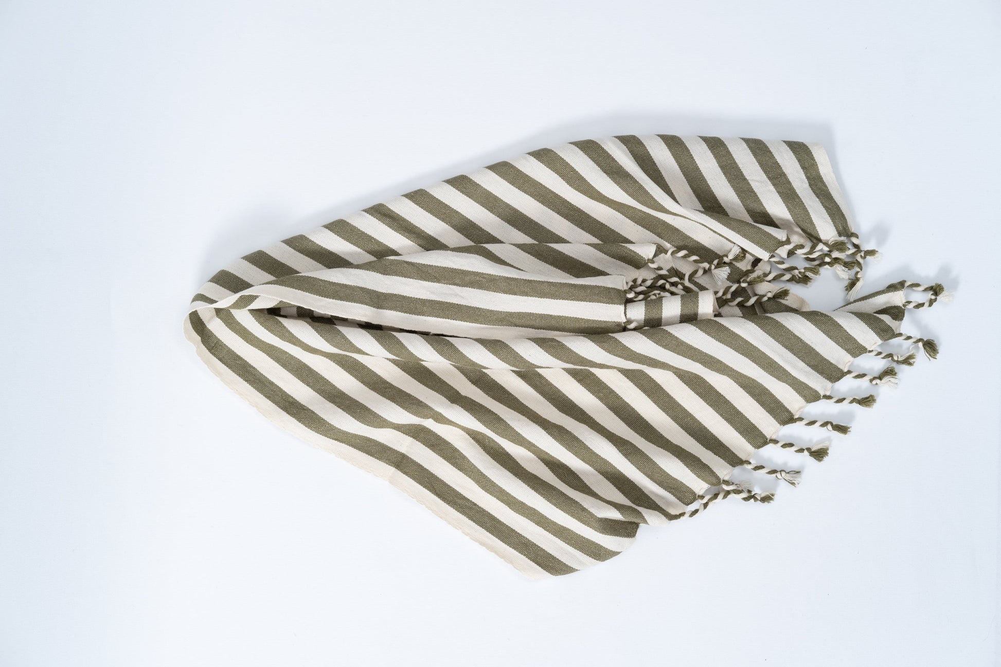 Featuring a captivating combination of green khaki and white stripes, this towel adds a touch of sophistication to any setting. Its versatile design allows for a multitude of uses - whether you're lounging by the pool, indulging in a spa day, or simply enjoying a picnic in the park.