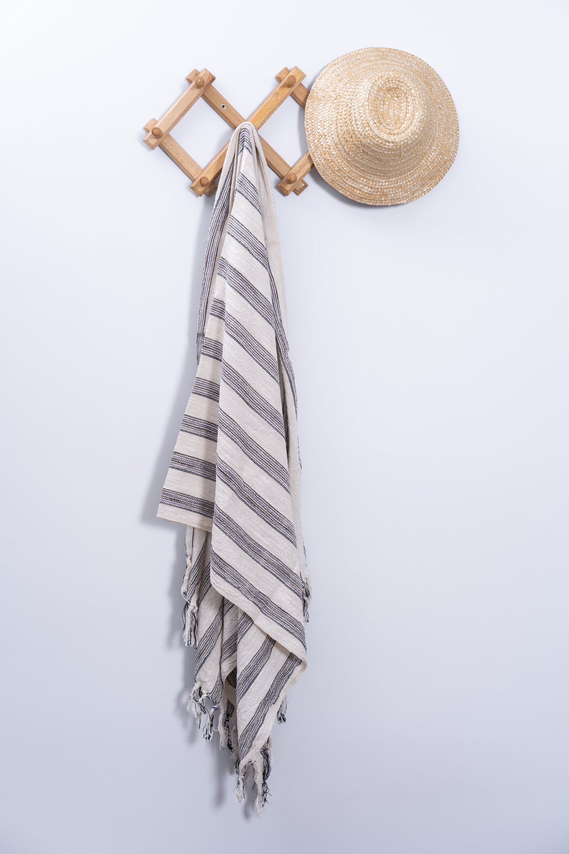 Introducing the Kas Turkish Towel - a luxurious blend of elegance and simplicity. Woven on traditional semi-automatic looms in Turkey, this towel is crafted from high-quality cotton and linen fibers. With its classic beige base and bold black stripes, the Kas towel is the perfect addition to any bathroom or spa setting. Soft, absorbent, and durable, this towel will only get better with age. Whether you're drying off after a shower or lounging on the beach, the Kas Turkish Towel is the ultimate in comfort and style.