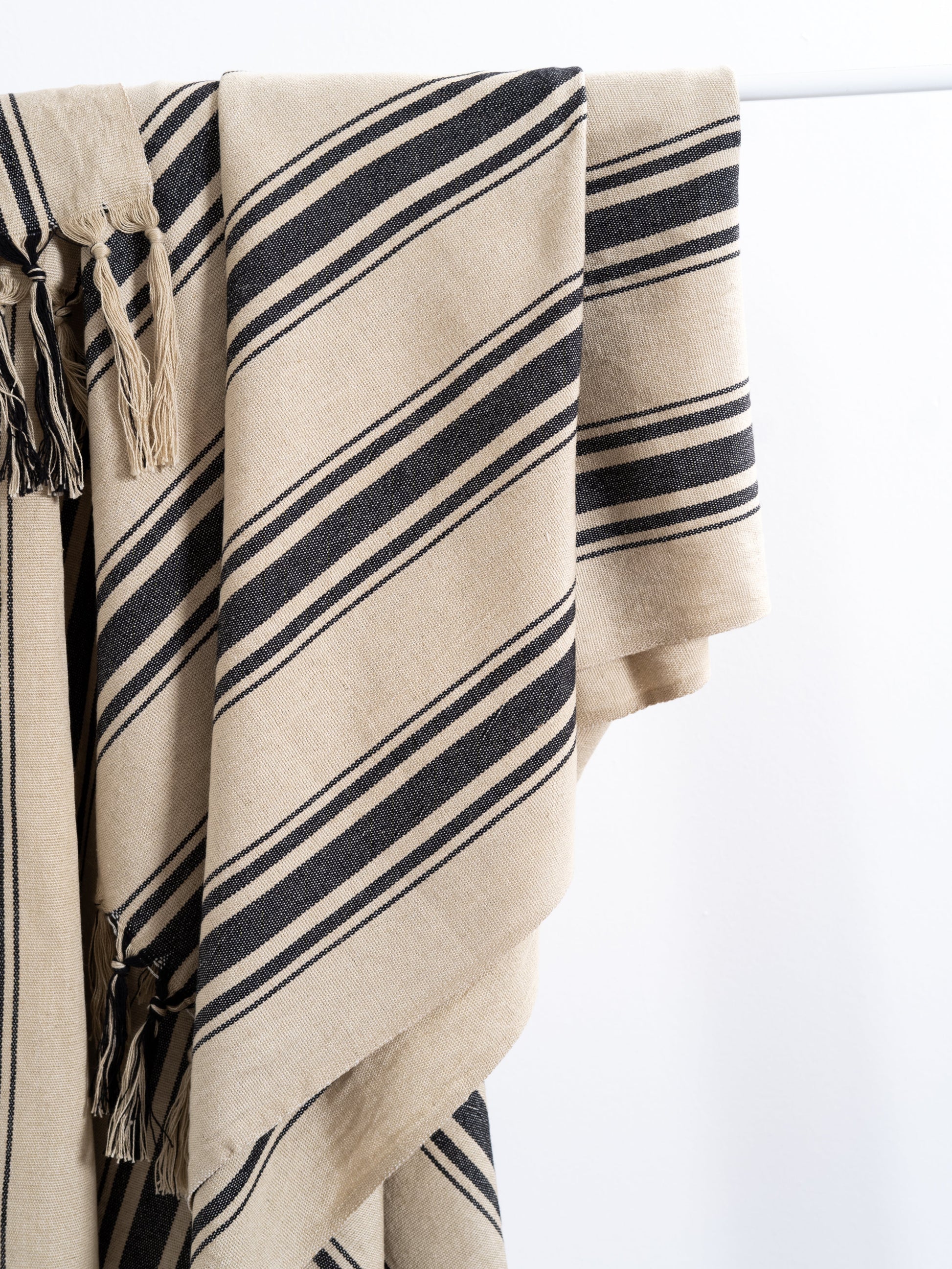 The Petra towel is a luxurious and stylish addition to any bathroom. Woven from a soft cotton-linen blend, this towel is not only absorbent, but also durable and long-lasting. The beige base color is accented by bold black stripes, adding a touch of modern elegance. Whether you're lounging at home or headed to the beach, this towel is the perfect accessory. Its unique design and high-quality construction make it a must-have for anyone looking to add some luxury to their daily routine.
