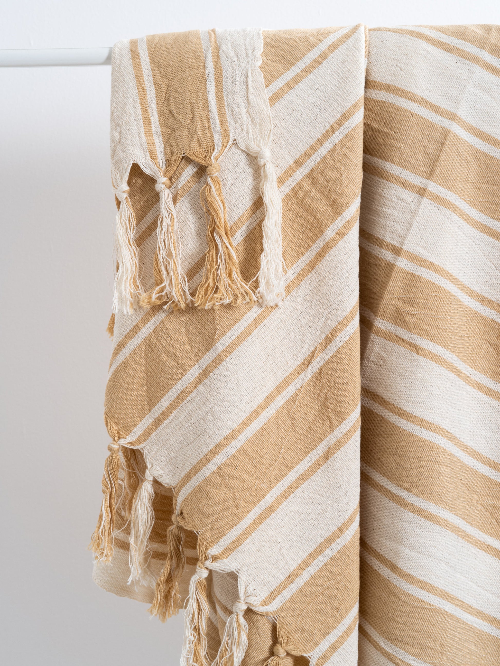Introduce your bathroom to a touch of luxury with our Sahara Towel. The beige base color is beautifully complemented by rust-colored stripes, creating a unique and stylish look. Made from a blend of premium cotton and linen, this towel is not only stylish but also highly absorbent and durable. Its versatile design makes it perfect for use as a bath towel, beach towel, or even a throw. Upgrade your bathroom decor and elevate your daily routine with our Sahara Towel.